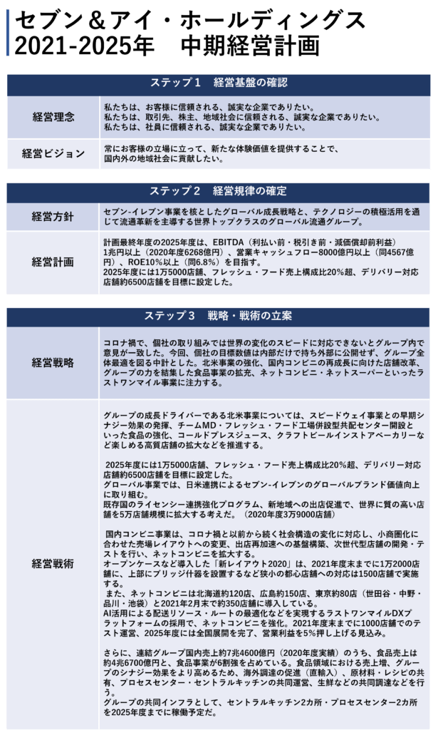 では、これらを踏まえて、セブン&アイ・ホールディングスの中期経営計画を図で整理してみます。