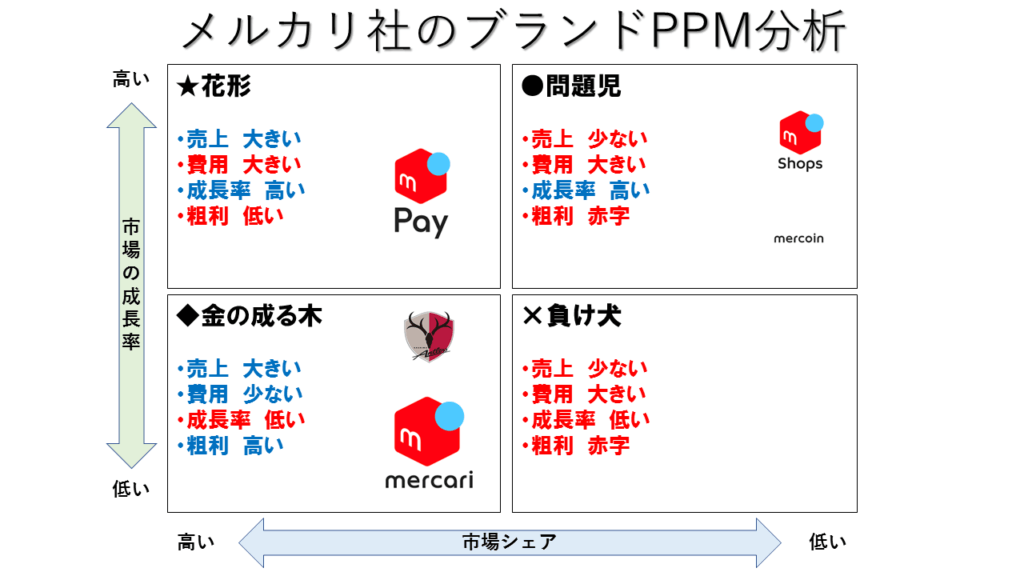 主要事業のフリマアプリと、鹿島アントラーズは、金のなる木に該当しています。急成長は難しいものの、安定的な売上高を獲得できる事業です。