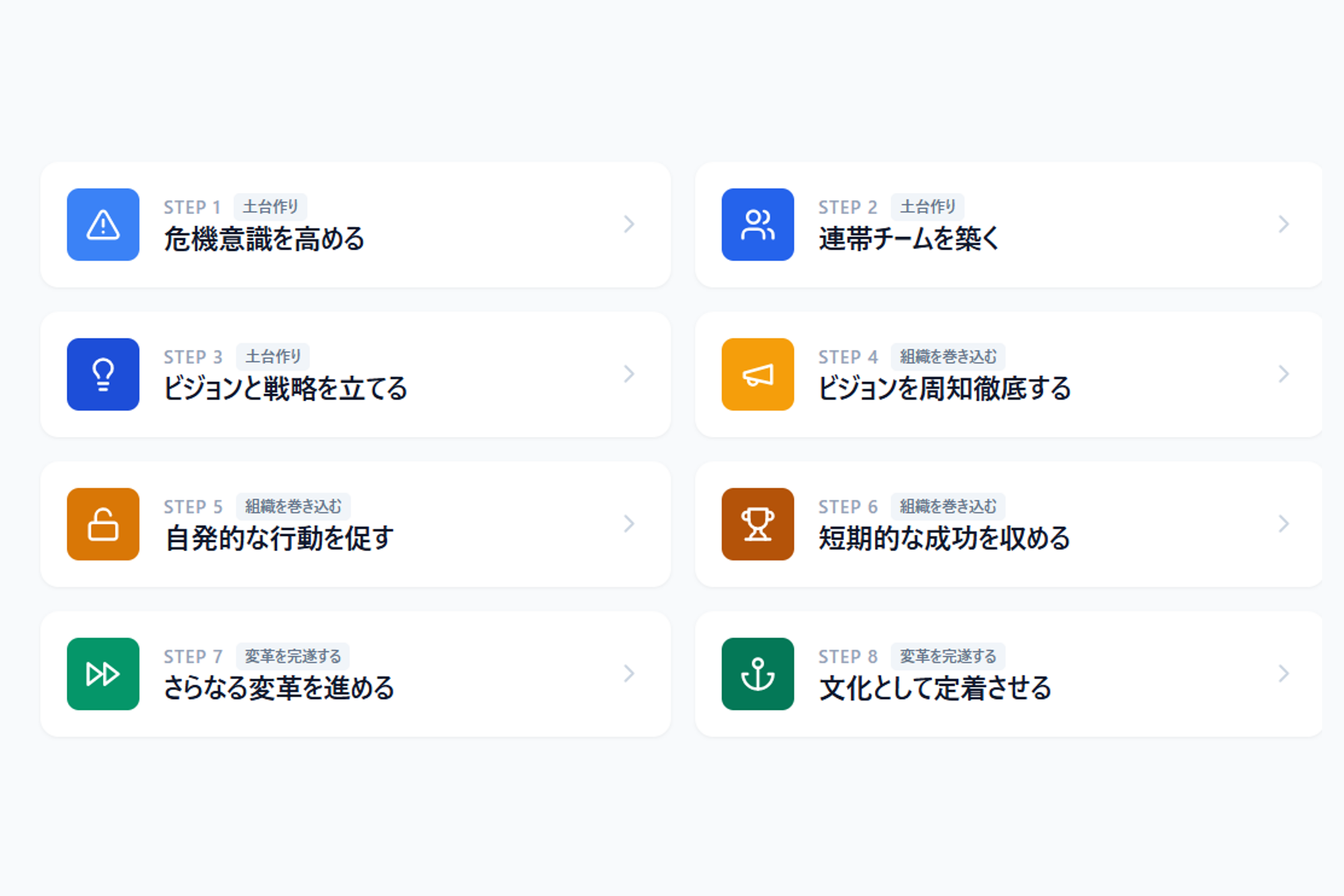 ハーバード・ビジネス・スクールのジョン・P・コッター教授が提唱したこのフレームワークは、組織が変化を定着させるための道筋を論理的に示したものです。多くの企業が変革に失敗する要因を分析した結果、導き出されたのがこの「8つのステップ」でした。