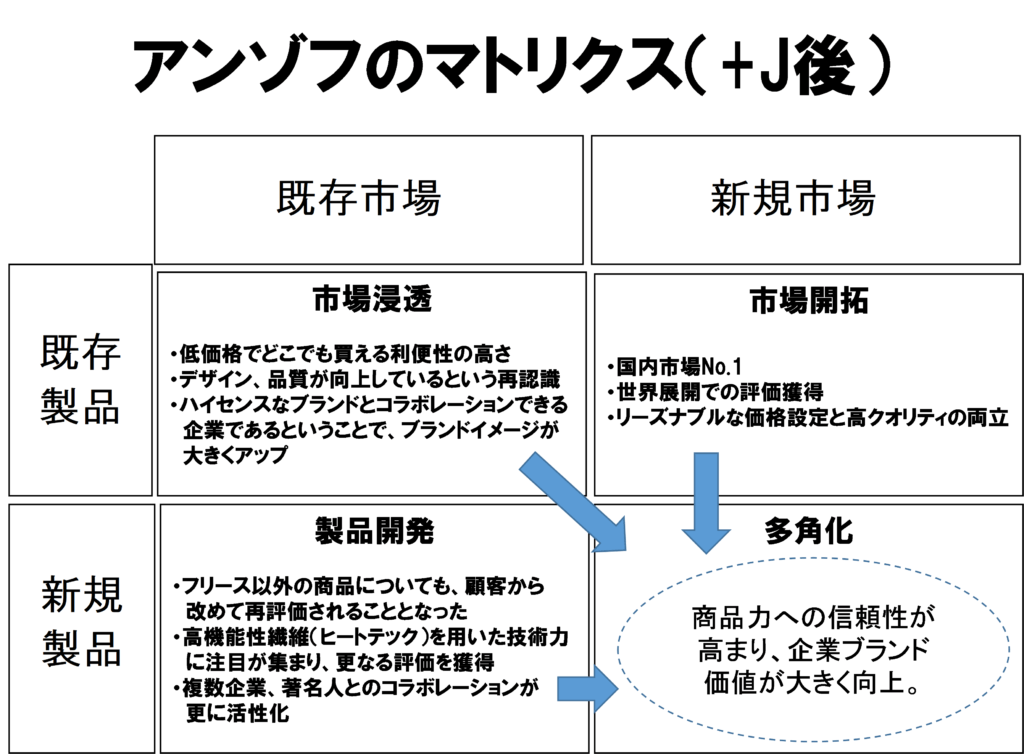 このブランドポジションの変革過程を、変則ではありますがアンゾフのマトリクスを使い整理すると、このようなイメージになるかと思います。