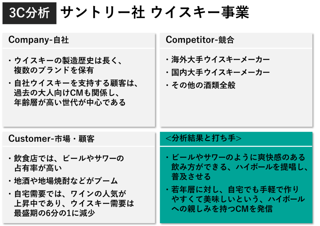 また、ウイスキー需要が落ち込んだときは、ハイボールの拡販を行うことで、ウイスキー需要を盛り上げる成果を生み出しました。